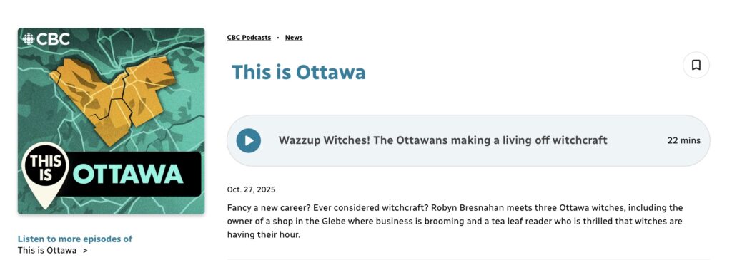 I am honoured to have given hundreds of Tea Leaf Readings. I have traveled with well-known Psychic Fairs and do participate in other professional Holistic Healing Events throughout the year, but the best place to find me regularly is at the magical Witch Chest Shop in the Glebe in Ottawa.
